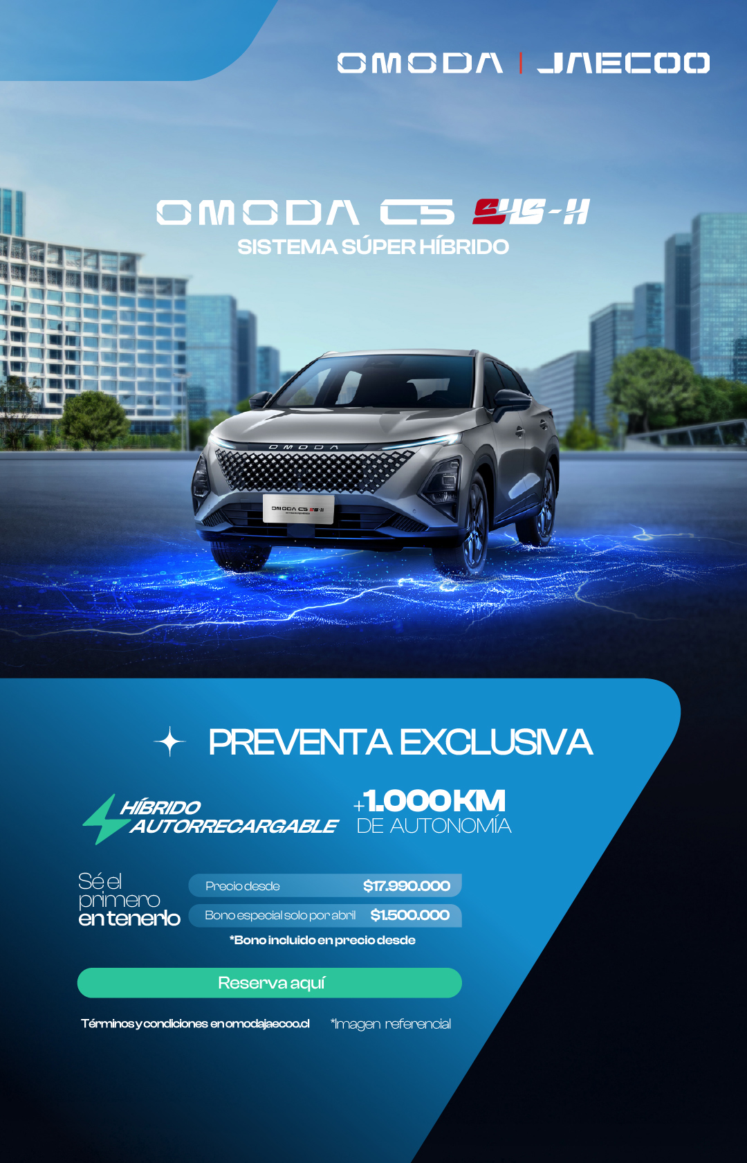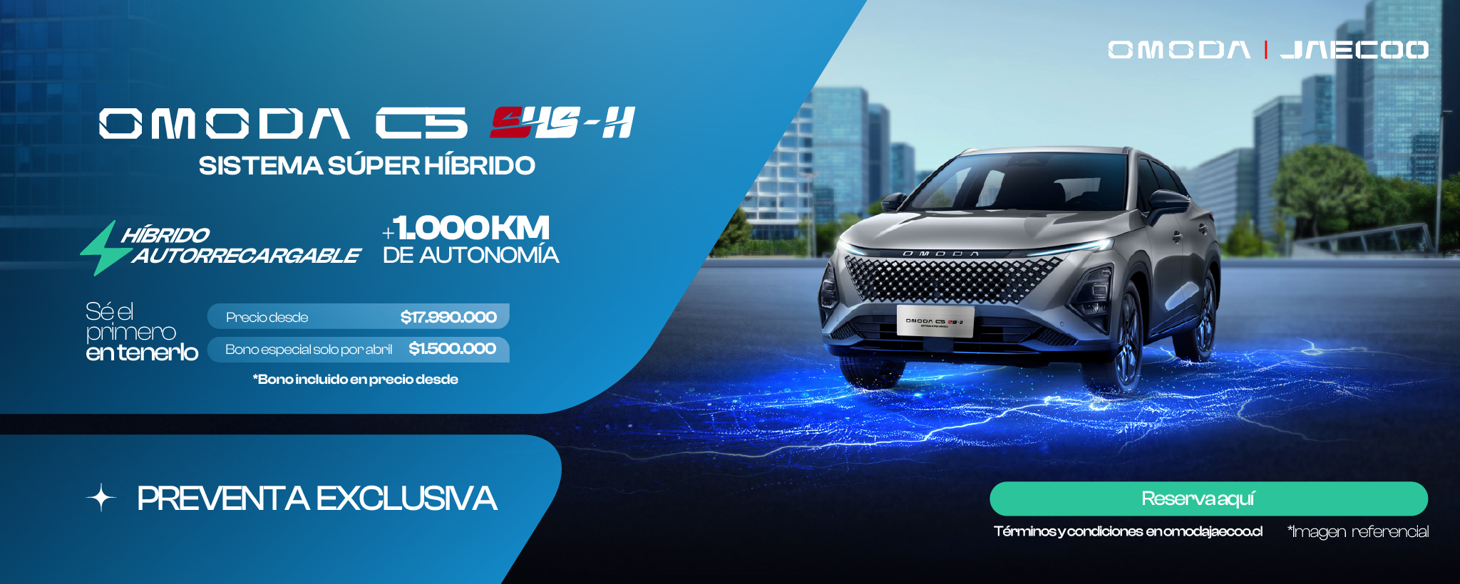 Ver versiones y precios Sé el primero en tenerlo Preventa especial OMODA C5 SHS Selecciona una versión COMFORT 1.5T DHT LUXURY 1.5T DHT ¡Gracias por tu envío! Hemos recibido tu información correctamente. Nombre completo * RUT * Teléfono * Email * Región * Selecciona Región. Comuna * Selecciona Comuna. Sucursal * Selecciona Sucursal. Autorizo de manera libre, informada e inequívoca a Chery Omoda & Jaecoo Motors SpA para que mis datos personales entregados mediante el presente formulario sean tratados y usados para ser contactado por Chery Omoda & Jaecoo Motors SpA, su red de concesionarios y/o sus Partners Financieros, de conformidad con la Política de Privacidad, con la finalidad de realizar una cotización / obtener una respuesta de solicitud. * Sí No Recibir información técnica y comercial del vehículo, a través de medios electrónicos y/o de forma telefónica. * Sí No Recibir información comercial de sus productos y servicios, promociones y/o comunicaciones de marketing, a través de medios electrónicos y/o de forma telefónica. (opcional) Sí No Enviar Ficha Técnica Preventa especial Blanco con negro El OMODA C5 SHS-H es un híbrido completo de autocarga, equipado con el motor más eficiente térmicamente del mundo. Con 224 HP, la eficiencia y el rendimiento ya no son mutuamente excluyentes: puedes tener lo mejor de ambos mundos. POTENCIA COMBINADA 224 HP SISTEMAADAS 15 SISTEMA DE AUDIO SONY 8 PARLANTES EFICIENCIA TÉRMICA 44,5% AUTONOMÍA +1000 km MOTOR 1.5 Turbo MODOS Eco y Sport AIRBAGS 7 COMFORT 1.5T DHT *PRECIO CON BONO DE FINACIAMIENTO $17.990.000 BONO DE FINANCIAMIENTO $1.500.000 PRECIO LISTA $19.490.000 Transmisión automática DHT 7 airbags Pantalla touch 12,3" Asientos con tapiz de eco cuero y tela 15 Asistencias a la conducción Preventa LUXURY 1.5T DHT *PRECIO CON BONO DE FINACIAMIENTO $20.490.000 BONO DE FINANCIAMIENTO $1.000.000 PRECIO DE LISTA $21.490.000 Sistema audio premium Sony de 8 parlantes Portalón trasero eléctrico Tapiz eco cuero color negro Sunroof eléctrico Barras de techo Preventa Los imagenes del vehículo referido son únicamente referenciales y pueden existir variaciones según la versión