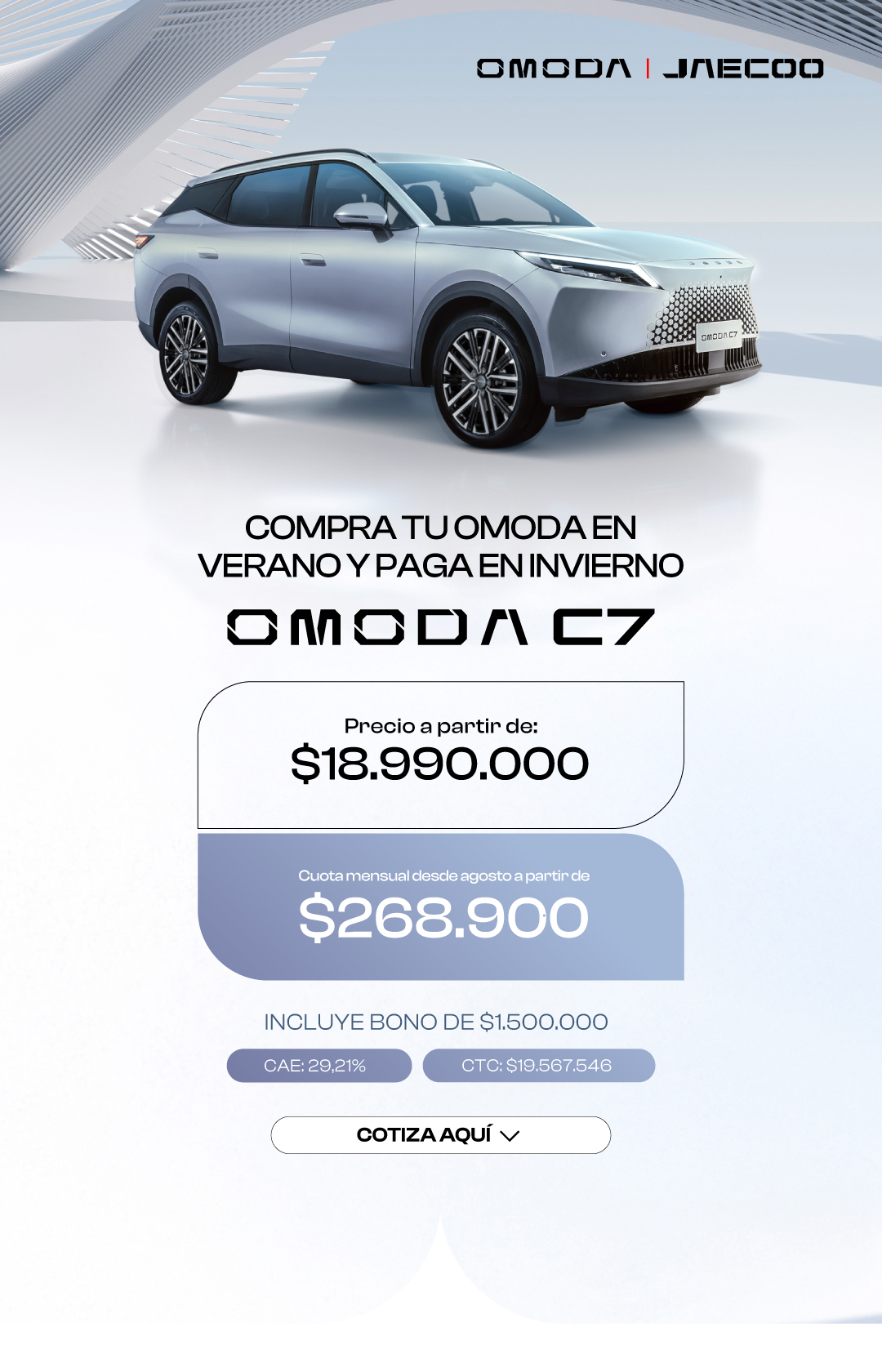 Inspirado en la innovación y pensado en la comodidad del usuario, el OMODA C7, es un SUV tecnológico, moderno e intuitivo, que redefine la experiencia de conducción.
