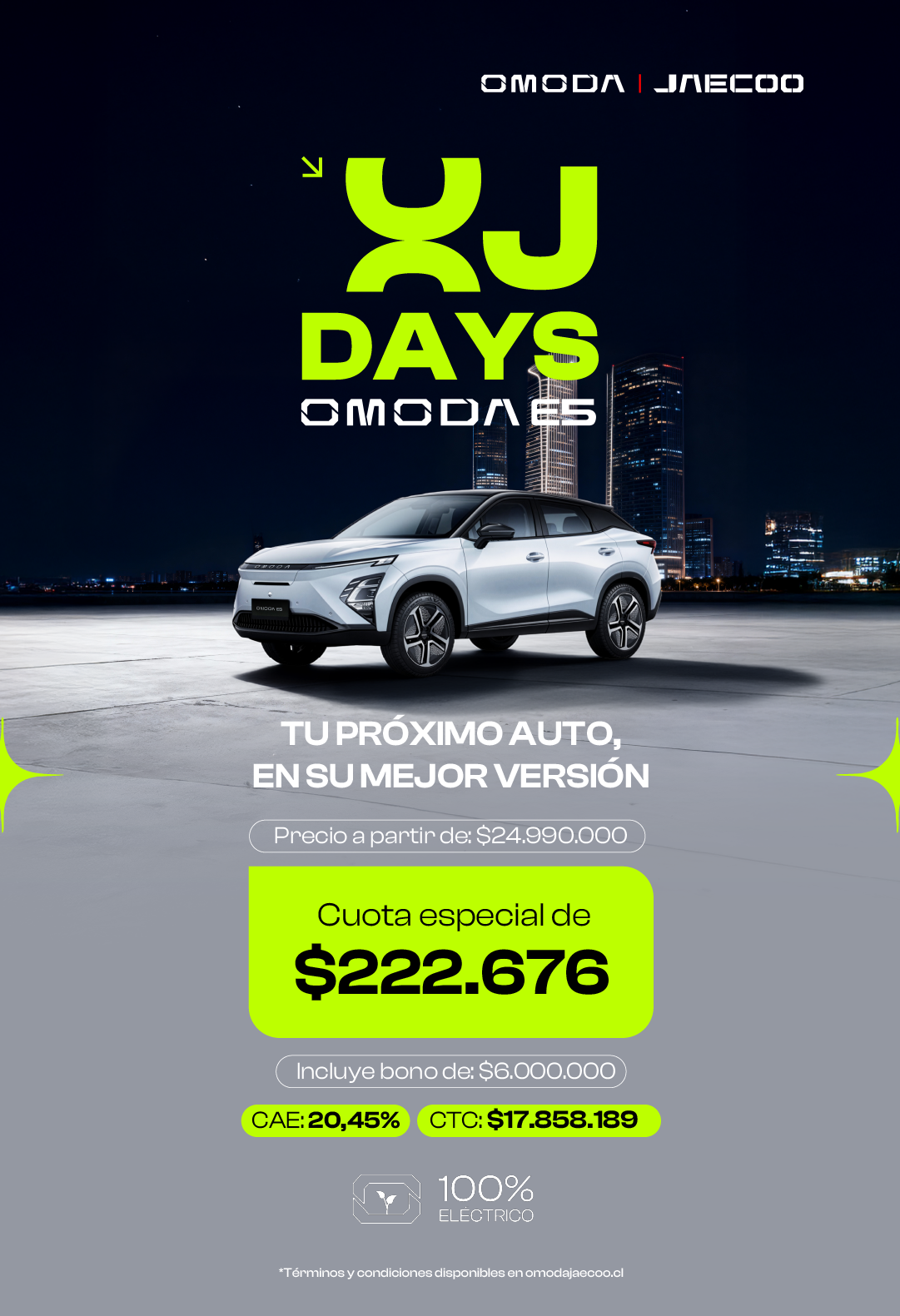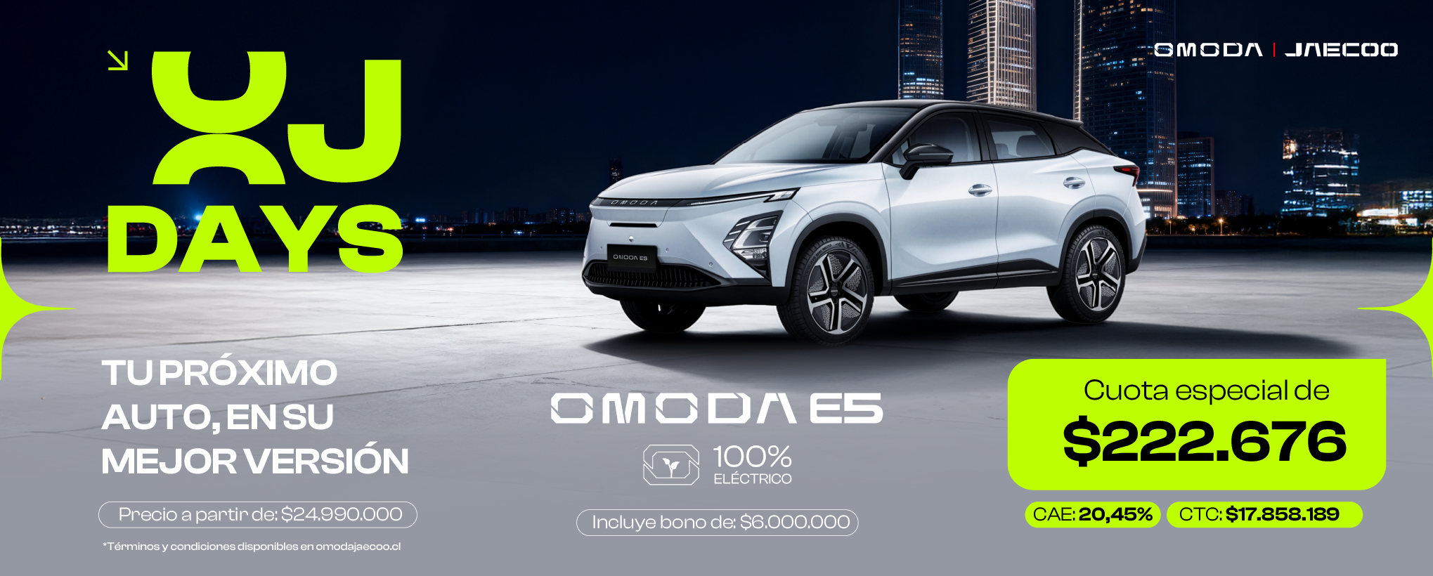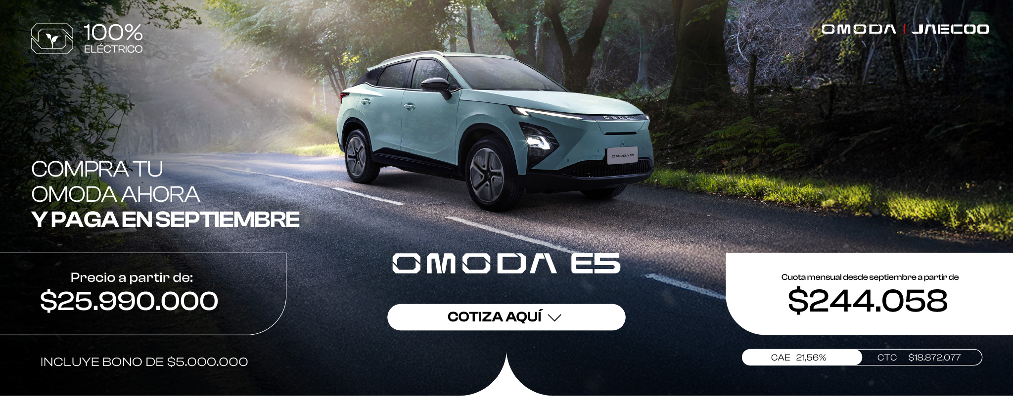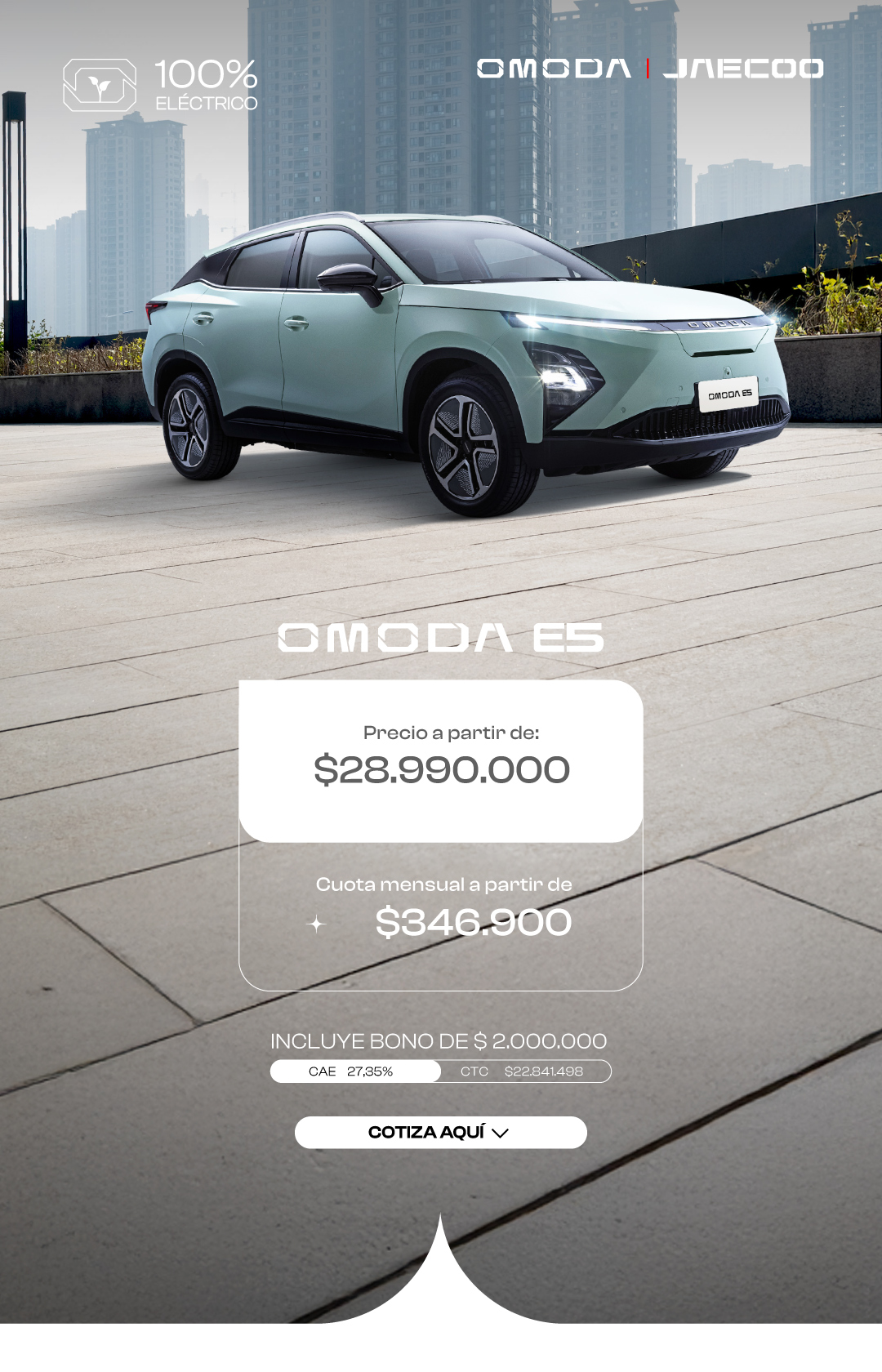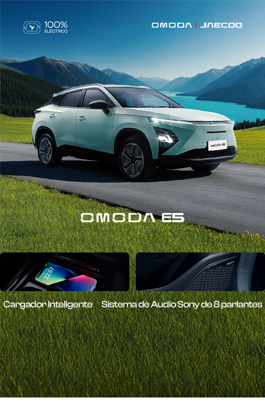 Conduce hacia un futuro más sostenible con el totalmente equipado OMODA E5, que cuenta con avanzadas tecnologías en baterías eléctricas LFP, brindando una experiencia única de conducción y una increíble autonomía eléctrica, además de un completo equipamiento de seguridad y tecnología